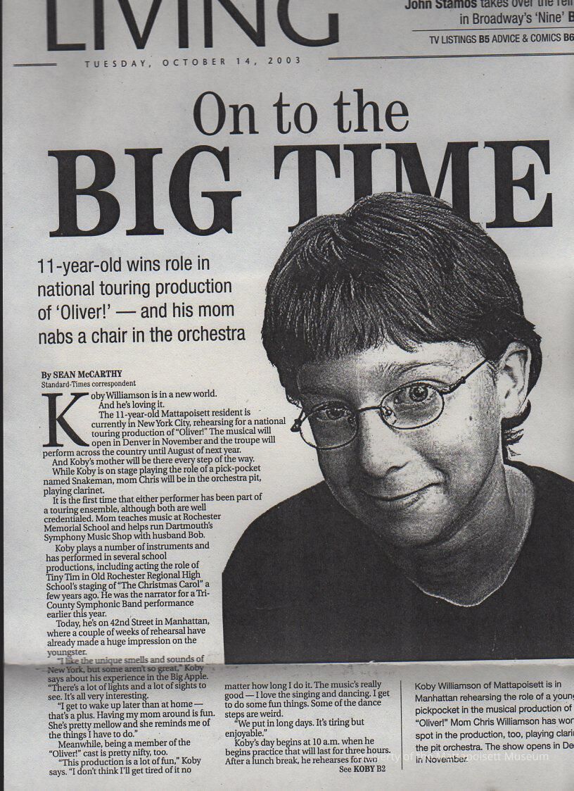 Standard-Times photocopy of article "On to the Big Time" 11-year-old wins role in national touring production of 'Oliver!' - and his mom nabs a chair in the orchestra. Koby Williamson and mom Chris.Collection
