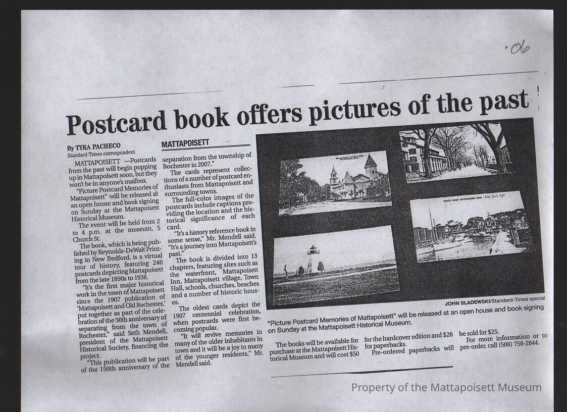 Standard-Times photocopy of article "Postcard book offers pictures of the past". Book "Picture Postcard Memories of Mattapoisett" as 150th anniversary of separation from Rochester.Collection