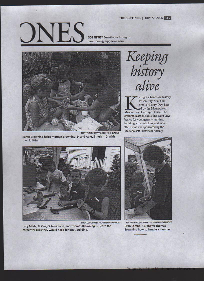 Sentinel photocopy of article "Keeping History Alive". Children's History Day at Mattapoisett Historical Society Museum and Carriage House.Collection