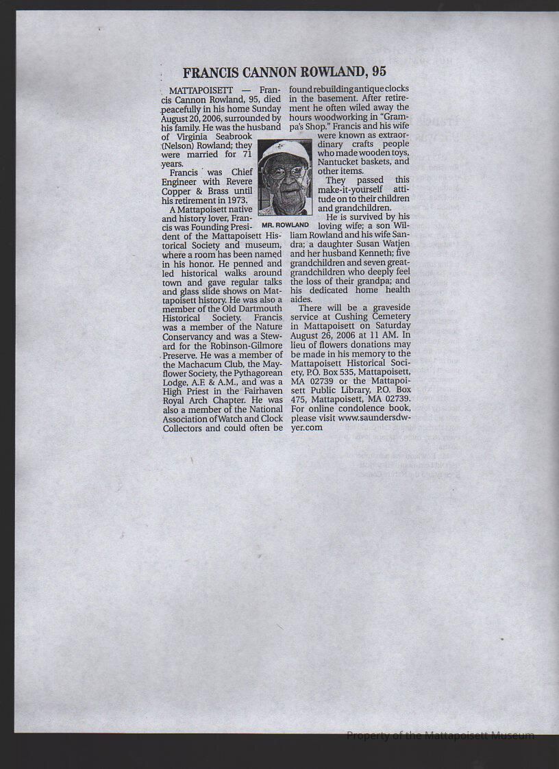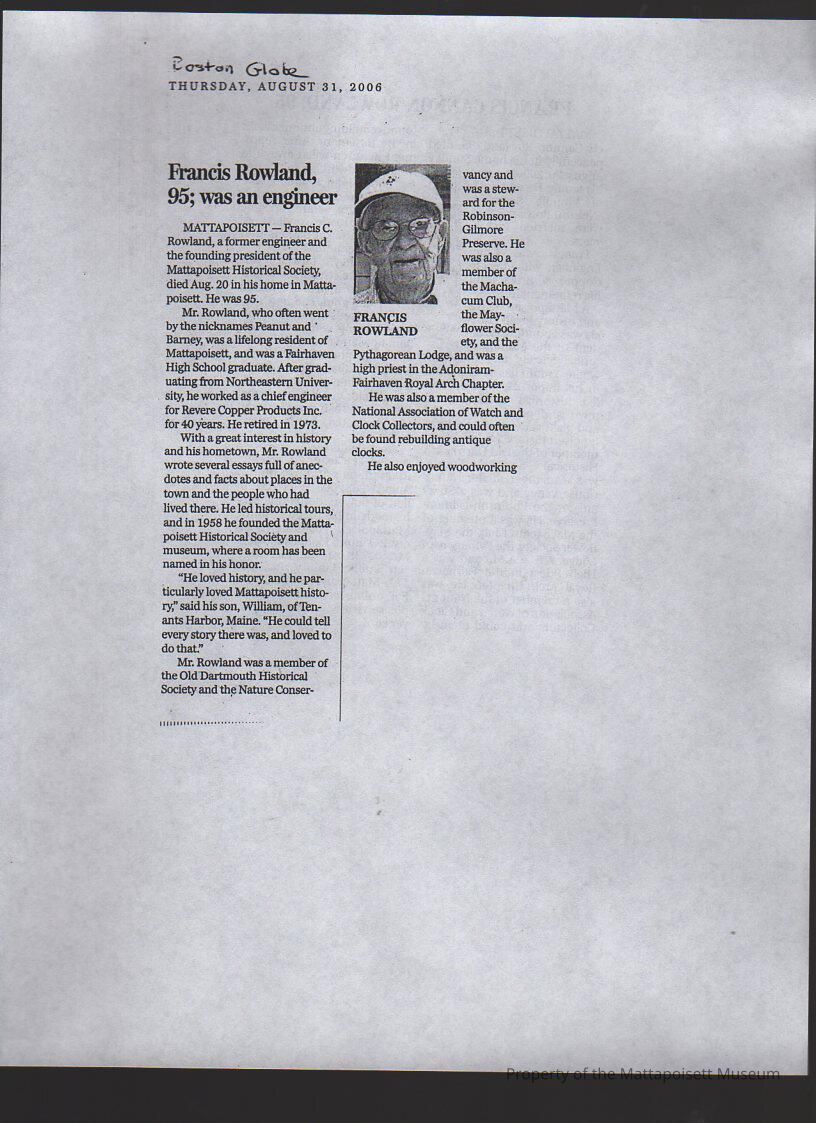 Boston Globe and other newspaper photocopy of obituary for Francis Rowland, 95; was an engineer. Founding president of Mattapoisett Historical Society Museum and Carriage House.Collection