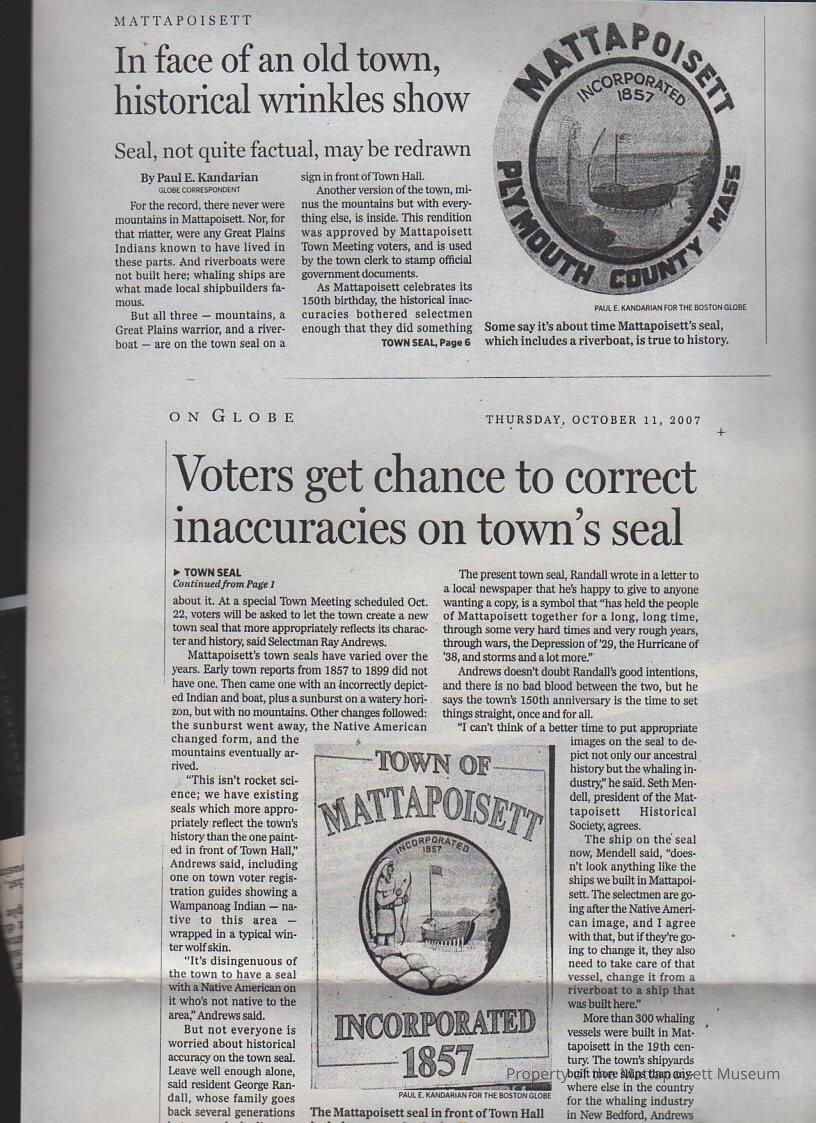 Boston Globe photocopy of article "In face of an old town, historcal wrinkles show" Seal, not quite factual, may be redrawn. Voters get chance to correct inaccuracies on town's seal.Collection