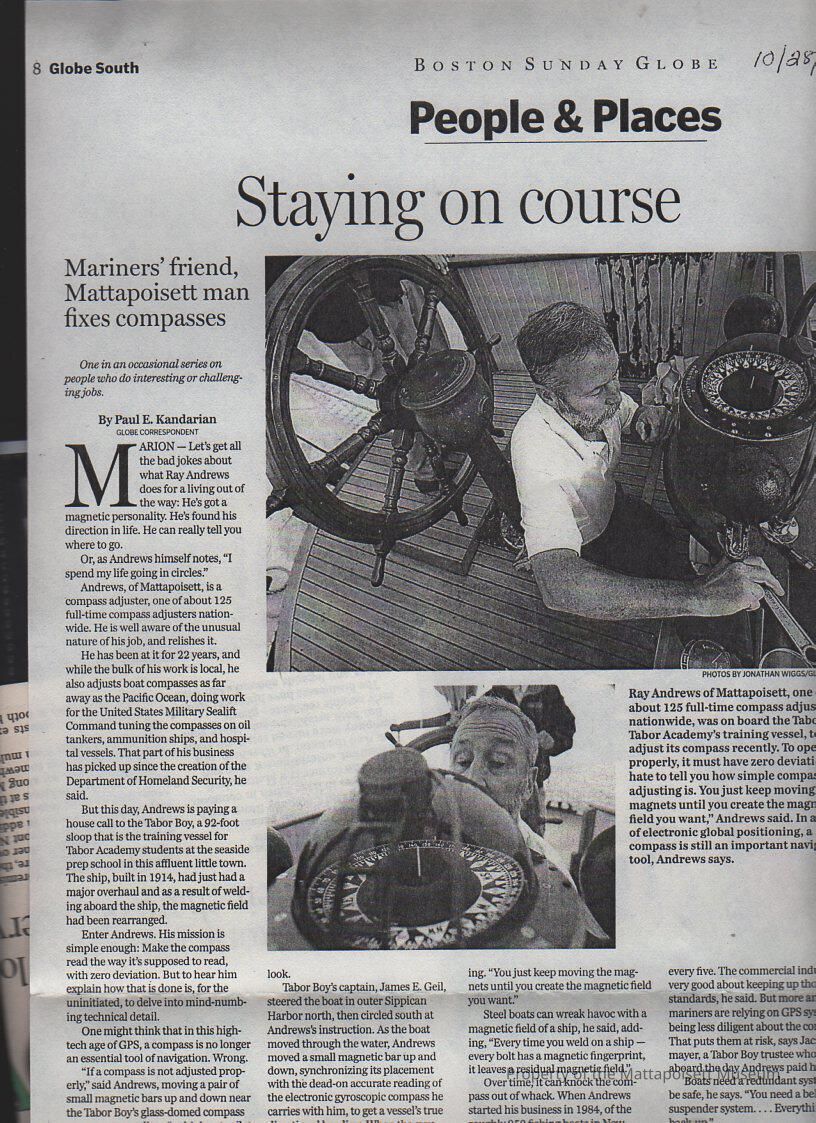 Boston Globe photocopy of article "Staying on course" Mariners' friend, Mattapoisett man fixes compases. Ray Andrews, compass adjuster.Collection