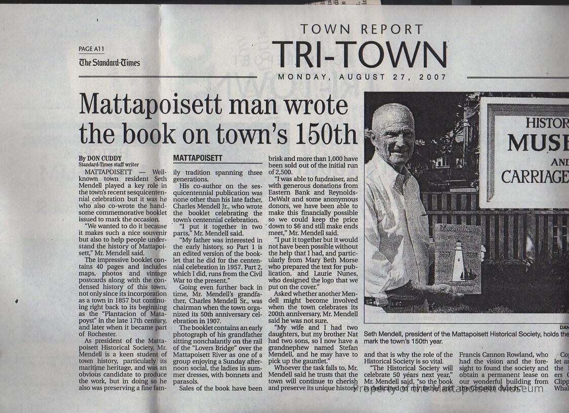 Standard-Times photocopy of article "Mattapoisett Man wrote the book on town's 150th". Seth Mendell co-wrote commemorative sesquicentennial booklet.Collection