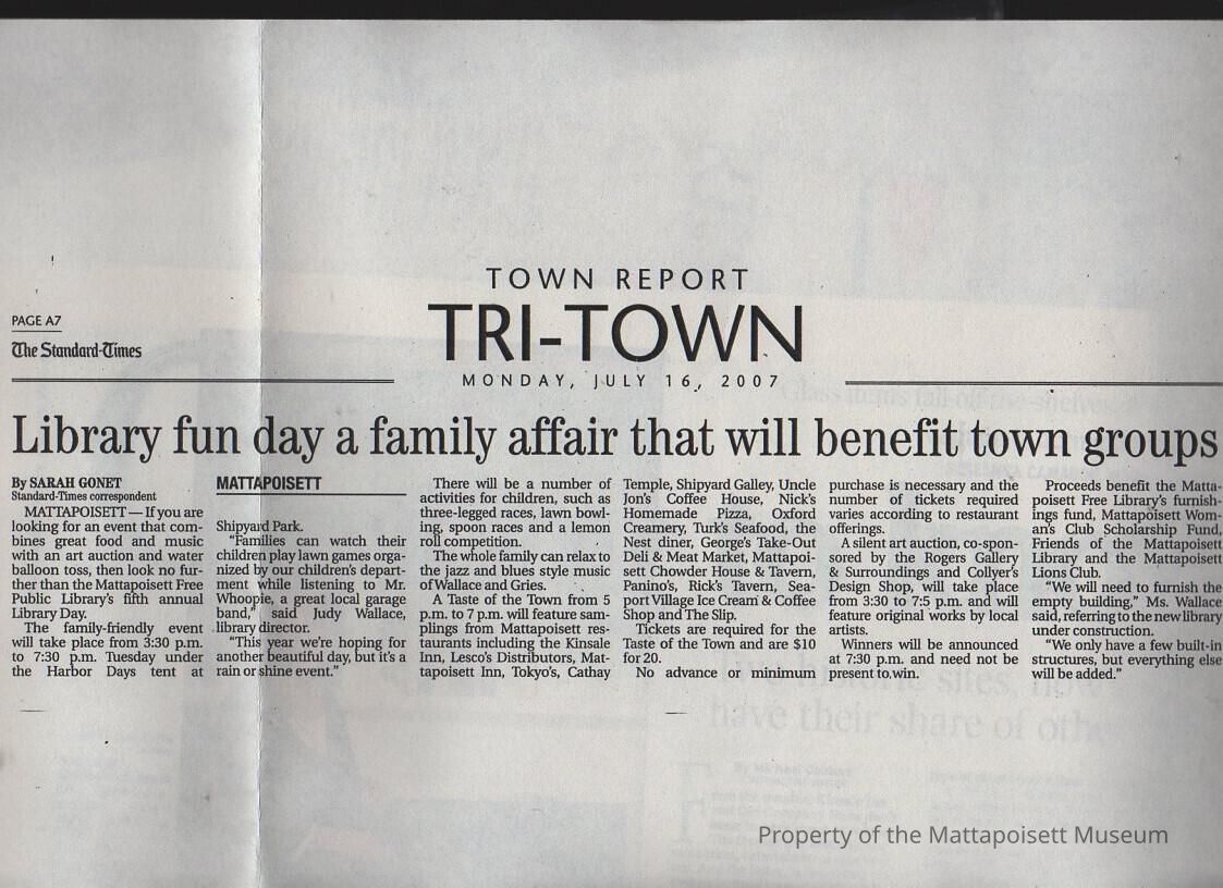 Standard-Times photocopy of article "Library fun day a family affair that will benefit town groups". Library's fifth annual Library Day.Collection