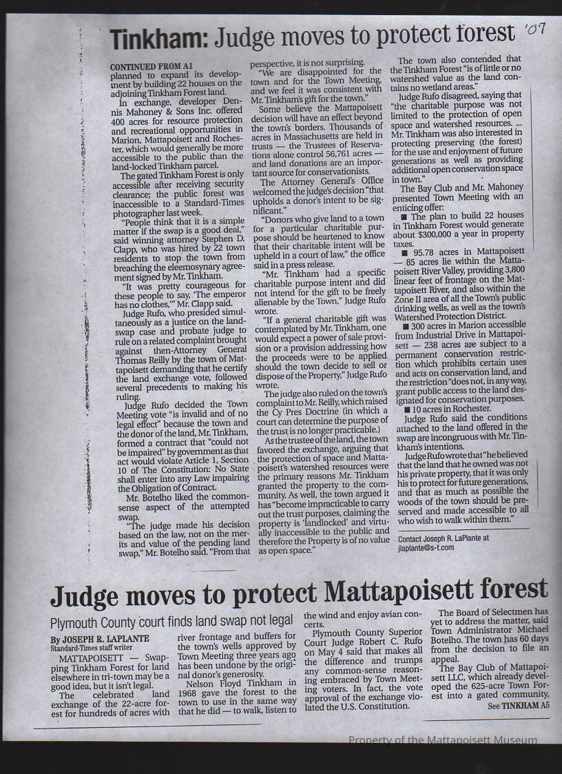Standard-Times photocopy of article "Judge moves to protect Mattapoisett forest" Plymouth County court finds land swap not legal.Collection