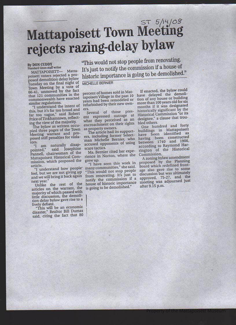 Standard-Times photocopy of article "Mattapoisett Town Meeting rejects razing-delay bylaw". Historical Commission, delay demolition of any house more than 100 years old to determine historical significance.Collection