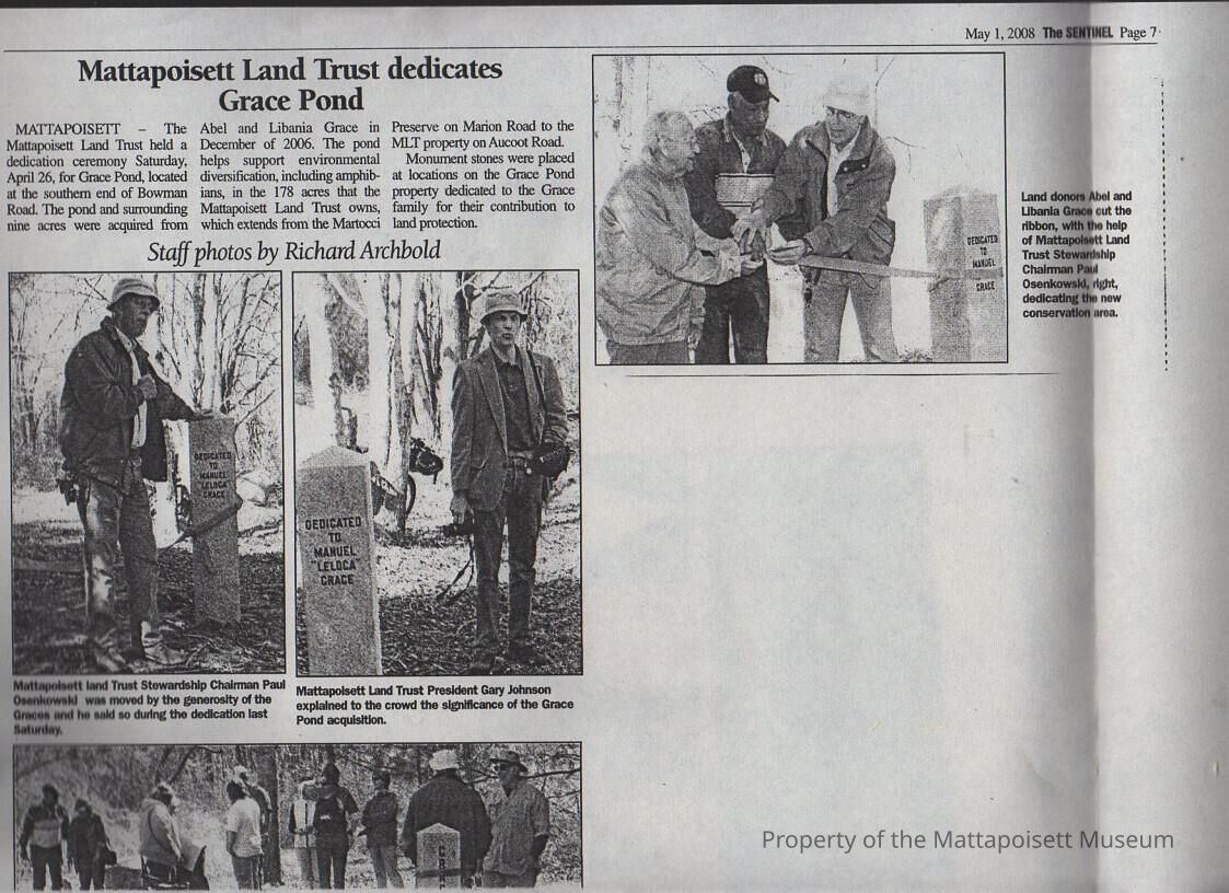 Sentinel photocopy of article "Mattapoisett Land Trust dedicates Grace Pond". Bowman Road.Collection