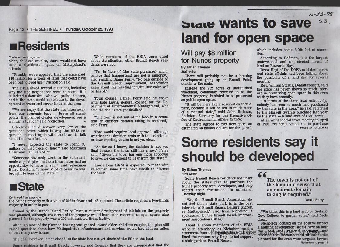Sentinel photocopy of articles "State wants to save land for open space" and "Some residents say it should be developed". Brandt BeachCollection
