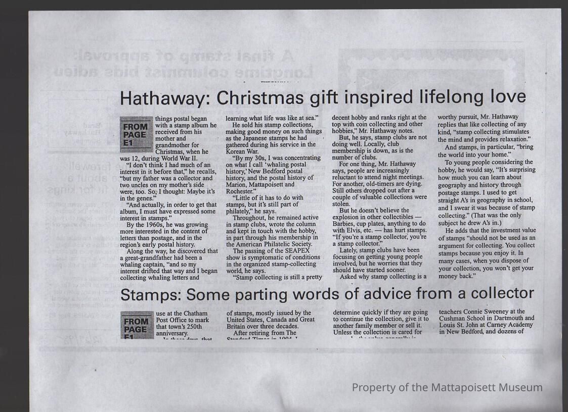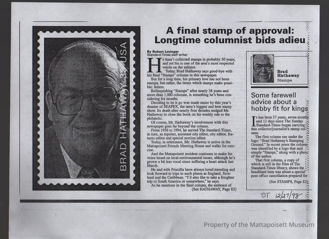 Standard-Times photocopy of article "A final stamp of approval" Longtime columnist bids adieu". Brad Hathaway, author of "Stamps" column.Collection