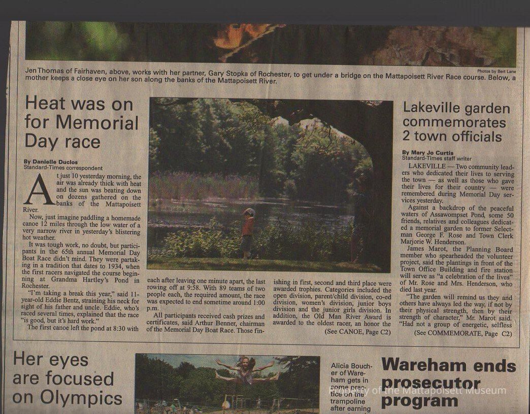Standard-Times article "Heat was on for Memorial Day race". Memorial Day Boat Race, Mattapoisett River.Collection