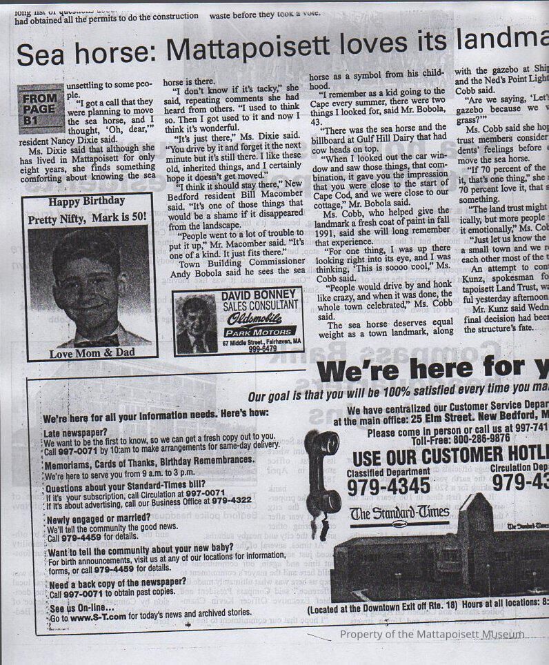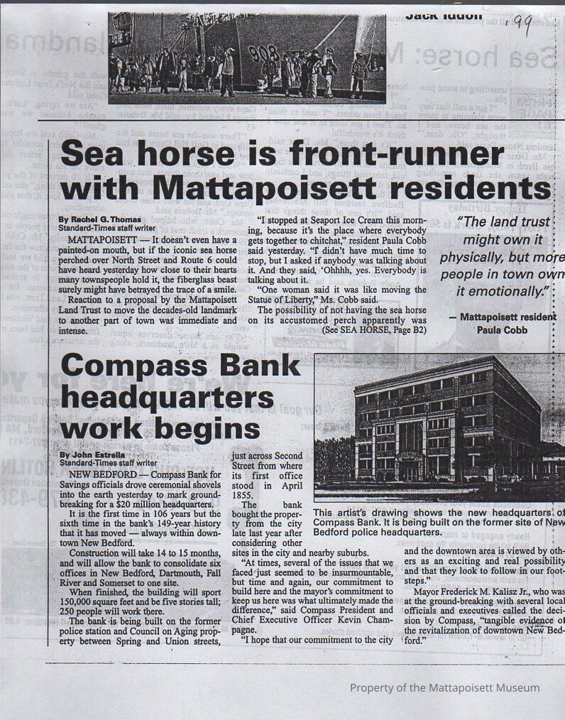 Newspaper photocopy of article "Sea horse is front-runner with Mattapoisett residents". Moving sea horse statue.Collection
