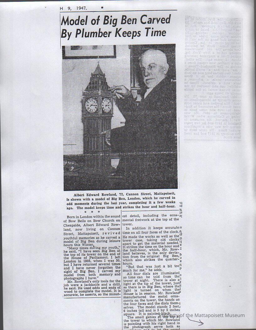 Newspaper photocopy of article "Model of Big Ben carved by plumber keeps time". Albert Edward Rowland of Cannon Street.Collection