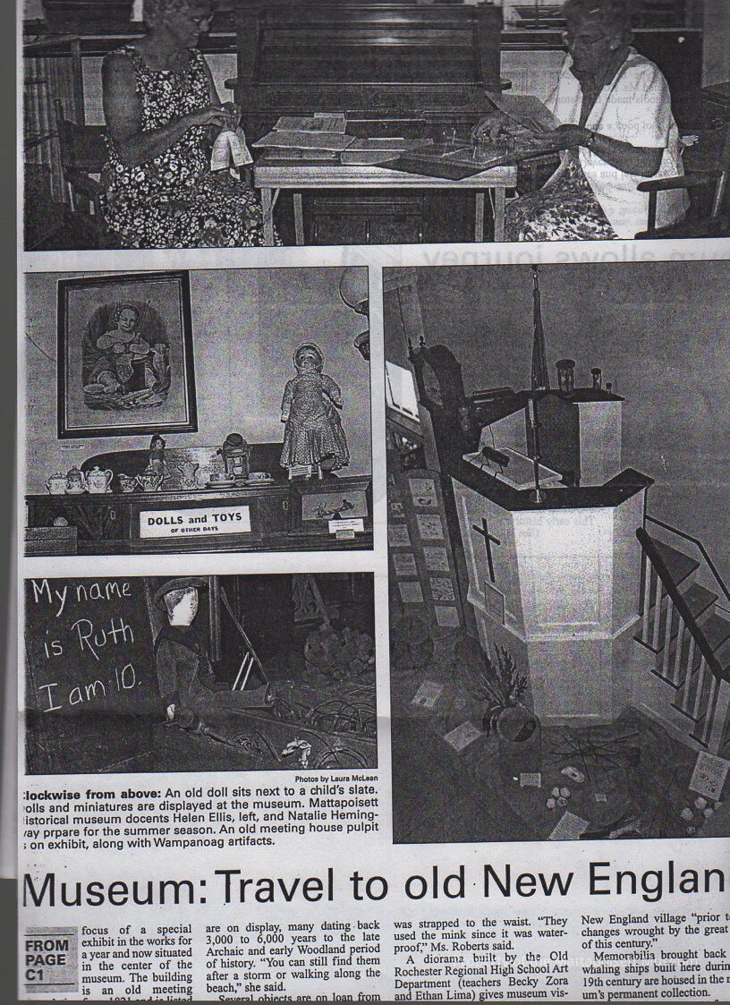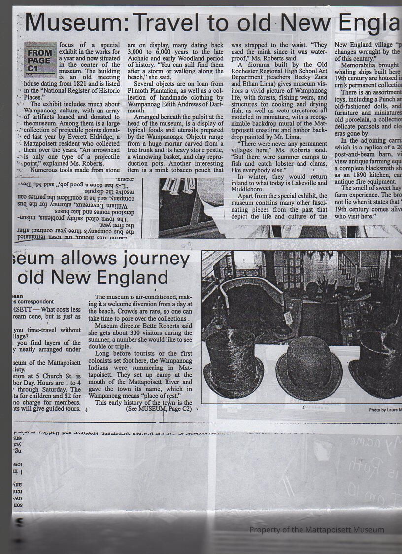 Newspaper photocopy of article "Museum: Travel to Old New England". Special exhibit at Mattapoisett Historical Museum of Wampanoag culture.Collection