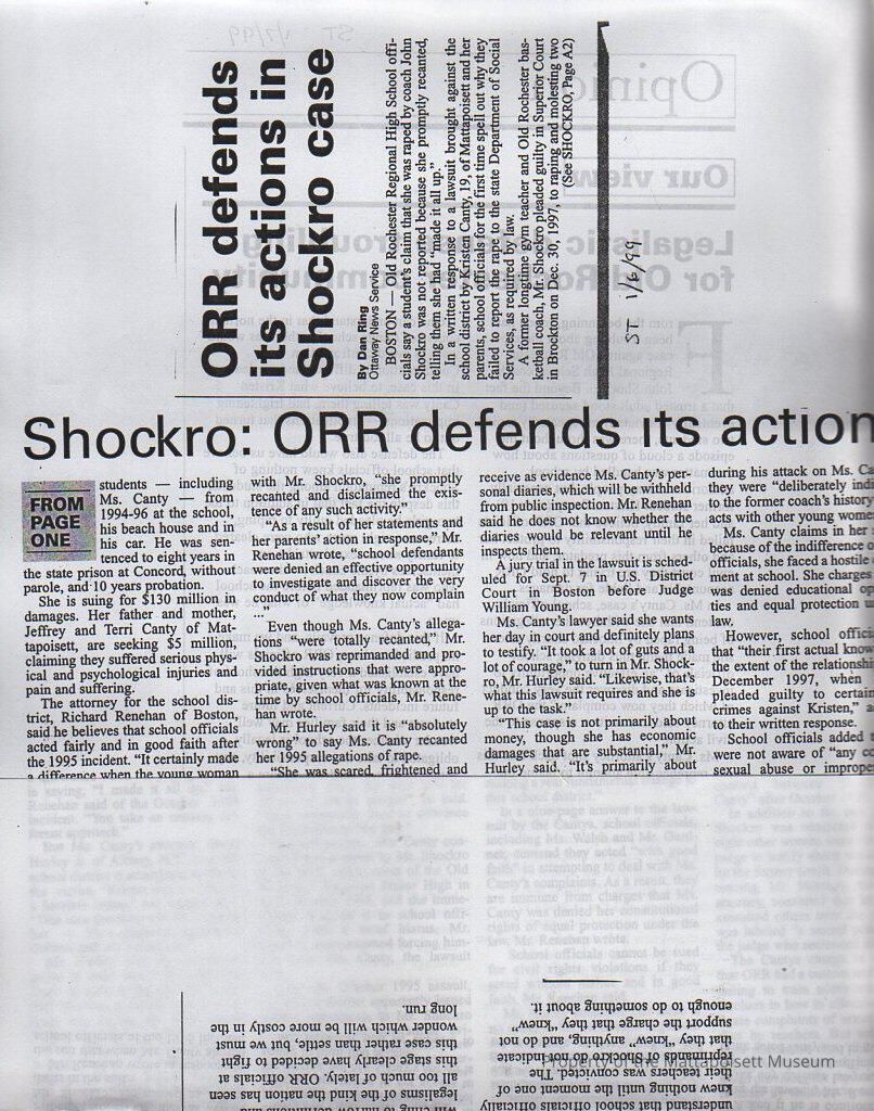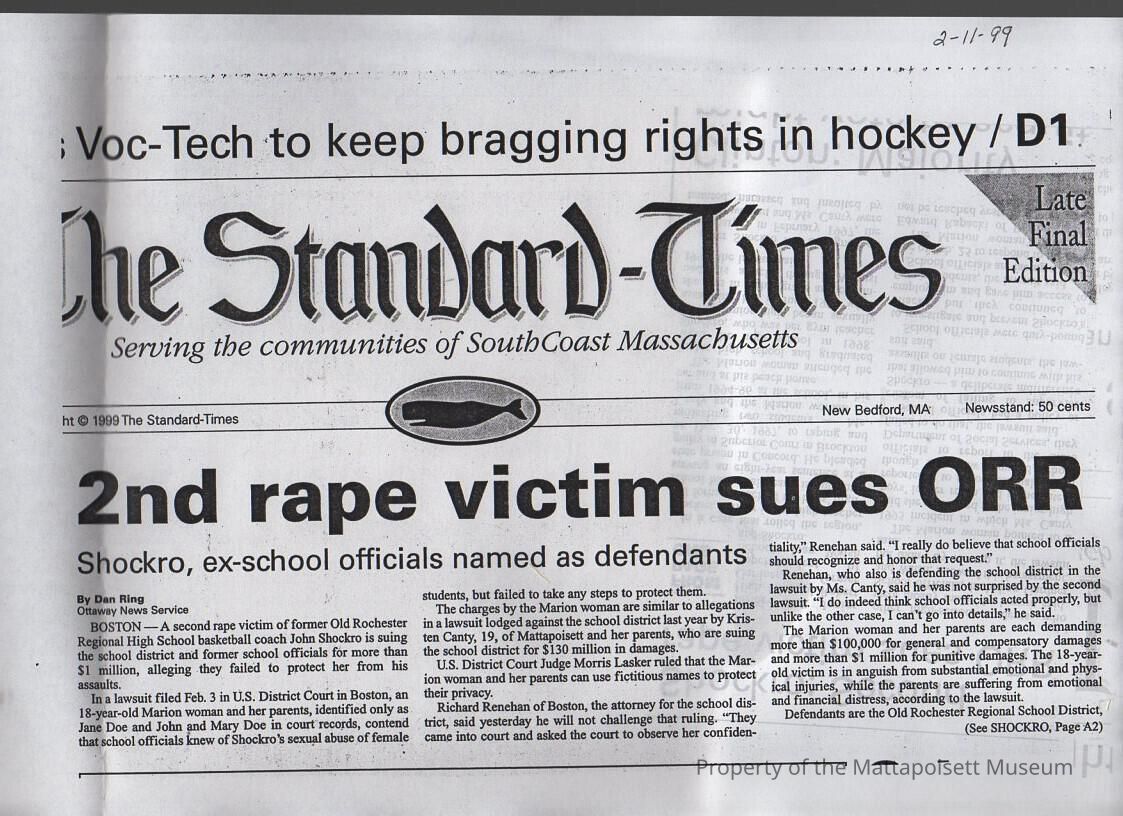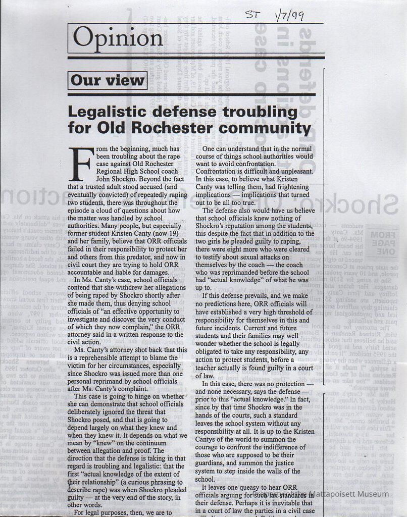 Newspaper photocopy of articles "Legalistic defense troubling for Old Rochester (Regional High School) community". Accusation of rape at ORRHS, multiple charges, and accusing school ignoring pleas.Collection