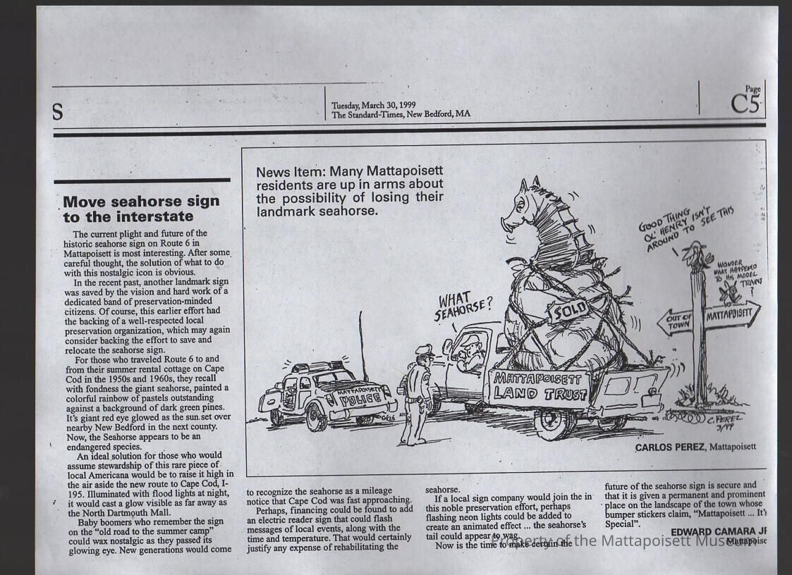 Standard-Times photocopy of article "Move seahorse sign to the interstate".Collection