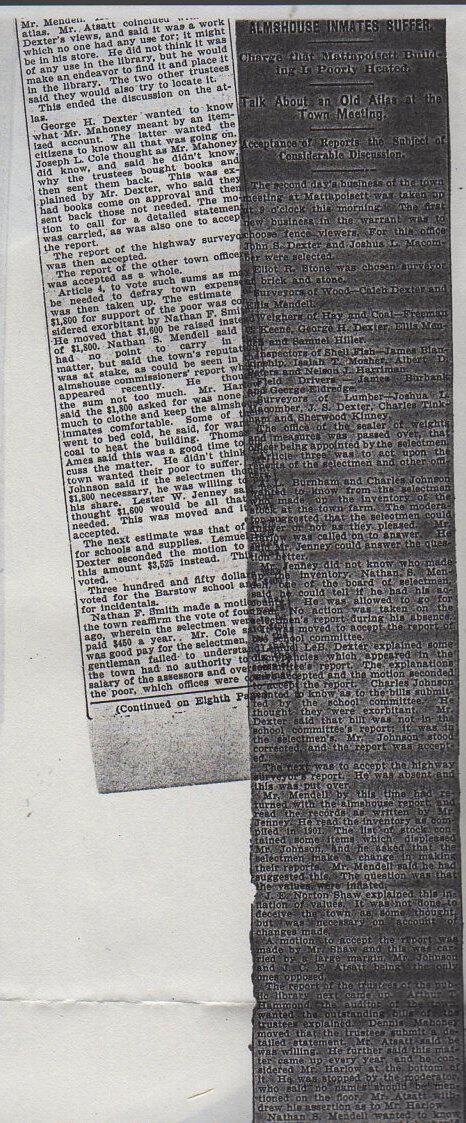 Newspaper photocopy of article "Almshouse inmates suffer" Charge that Mattapoisett building is poorly heated, talk about an Old Atlas at this town meeting, acceptance reports the subject of considerable discussion.Collection