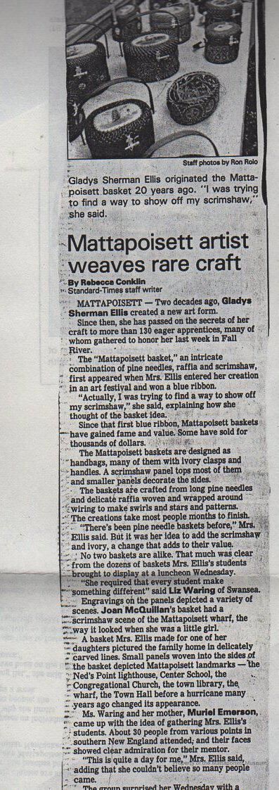 Standard-Times photocopy of article "Mattapoisett artist weaves rare craft". Gladys Sherman Ellis, scrimshaw "Mattapoisett" baskets.Collection