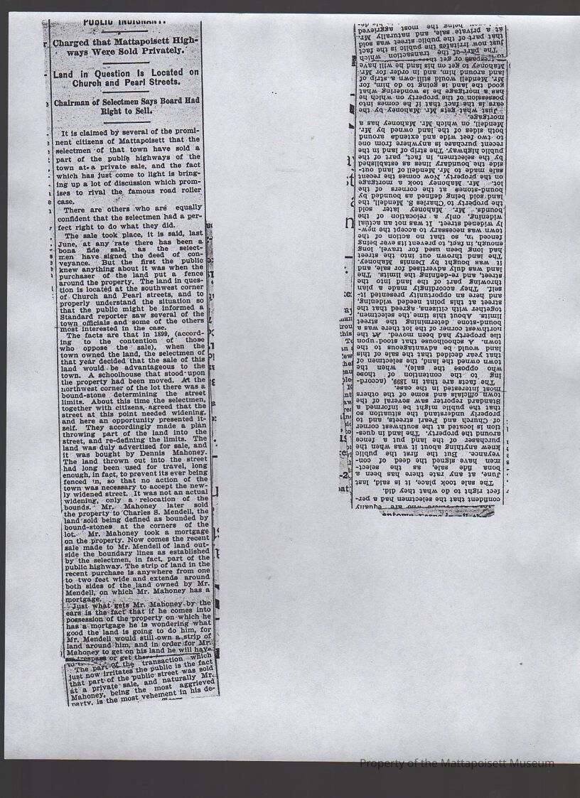 Newspaper photocopy of article "Public -" Charged that Mattapoisett Highways were sold privately, land in question is located on Church and Pearl Streets, Chairman of Selectmen says board had right to sell.Collection