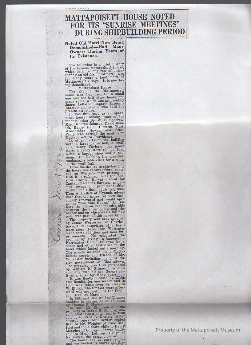 Newspaper photocopy of article "Mattapoisett House noted for its 'Sunrise Meetings' during shipbuilding period" Noted Old Hotel now being demolished - had many owners during years of its existance.Collection
