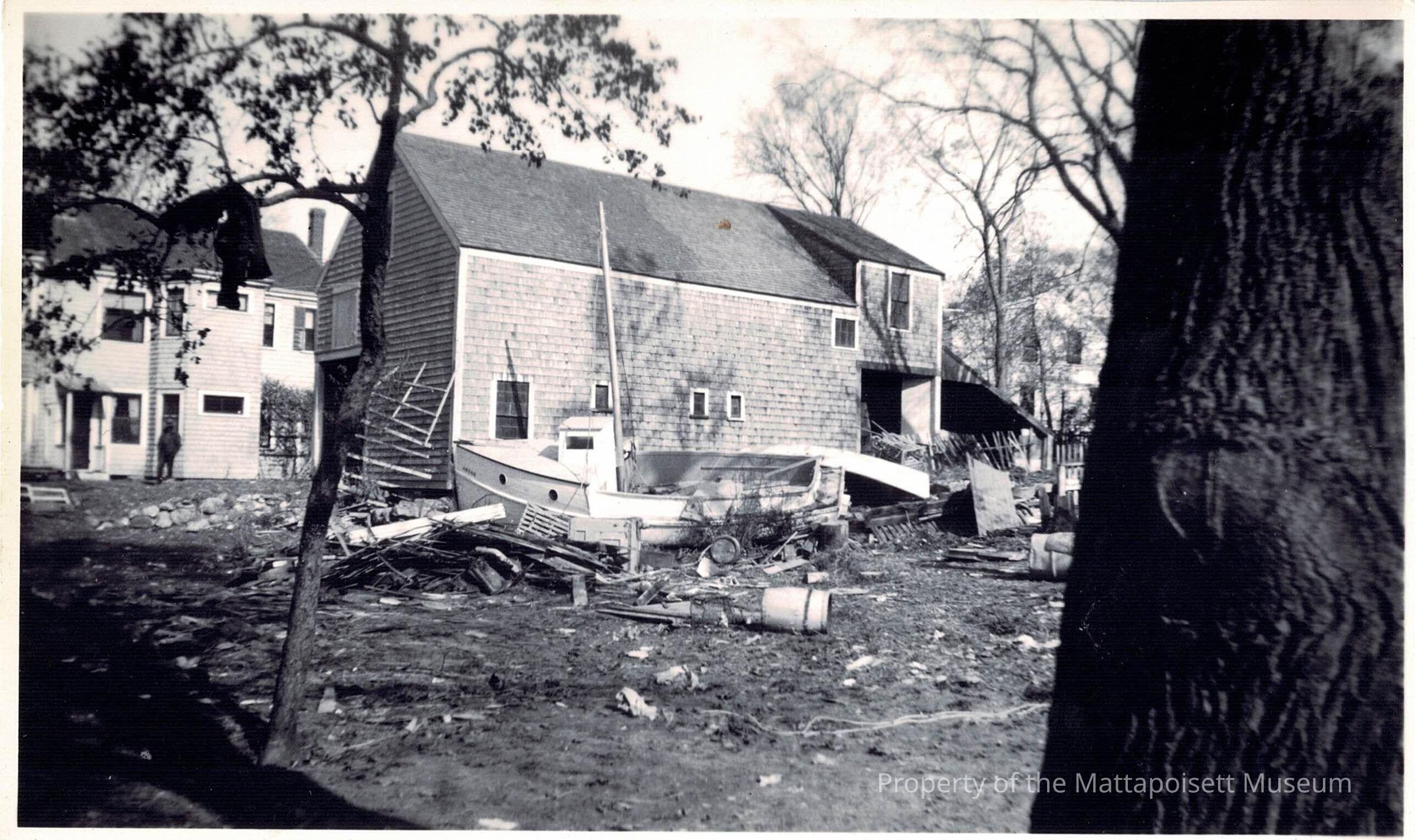 A small B&W photo showing the aftermath of the 1938 hurricane in Mattapoisett.Collection