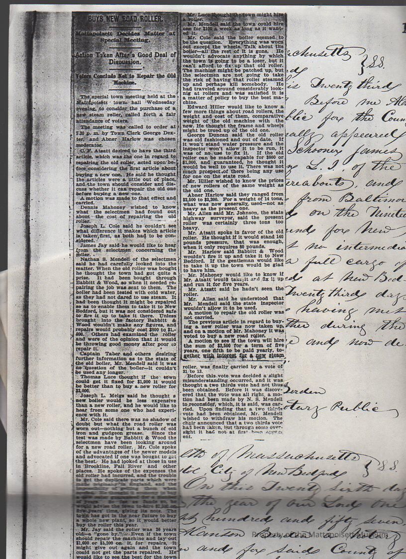 Newspaper photocopy of article "Buys new road roller" Mattapoisett decides matter at Special Meeting, Action taken after a good deal of discussion, Voters conclued not to repair old machine.Collection