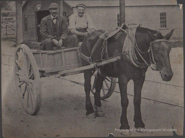 Picture from scrapbook of unidentified men on horse and cart.Collection