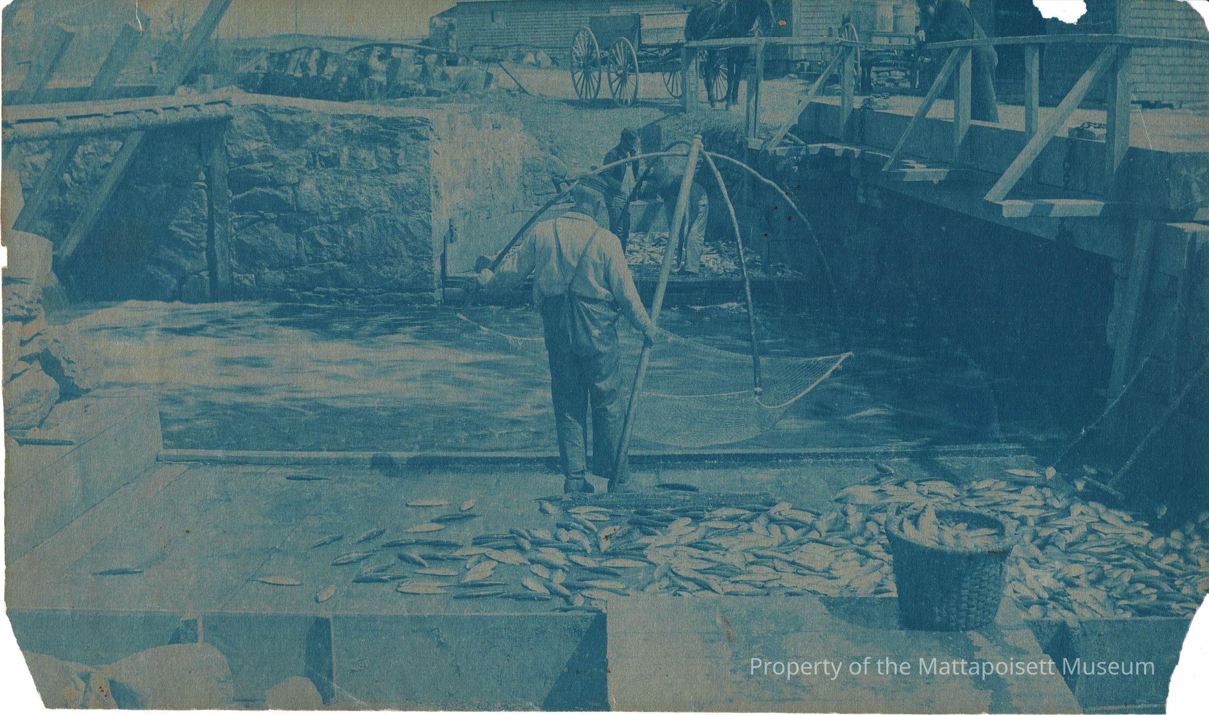Cyanotype photograph of the Herring Weir on the Mattapoisett River. Lilburne Hiller on the bridge and Alonzo Kinney in foreground with net.Collection