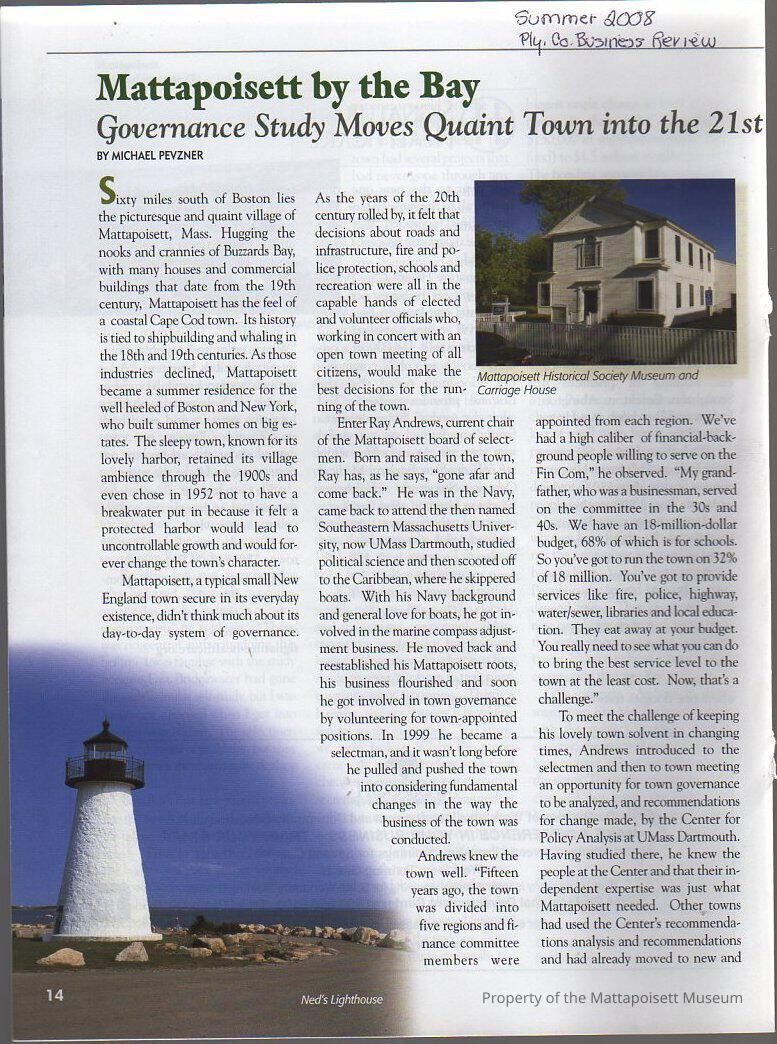 Plymouth County Business Review article "Mattapoisett by the Bay" Governance study moves quaint town to the 21st century.Collection