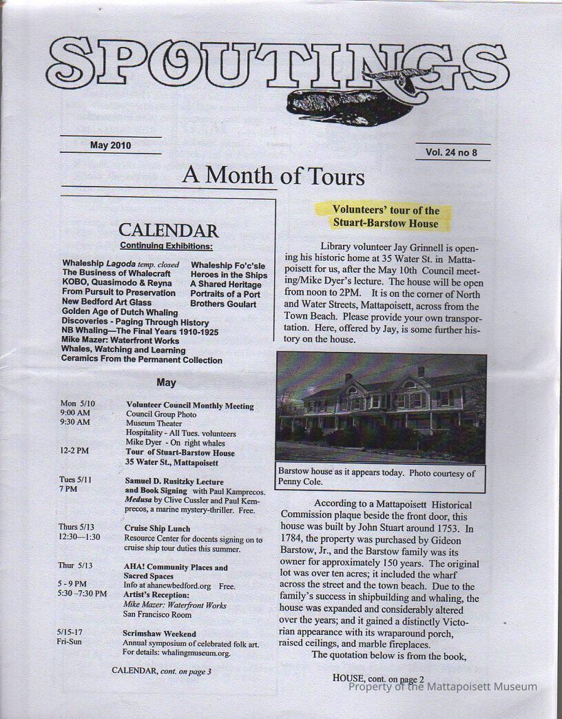 Spoutings, Vol. 24, No. 8. "Volunteers' tour of the Stuart-Barstow House". Open house at 35 Water St. Mattapoisett.Collection