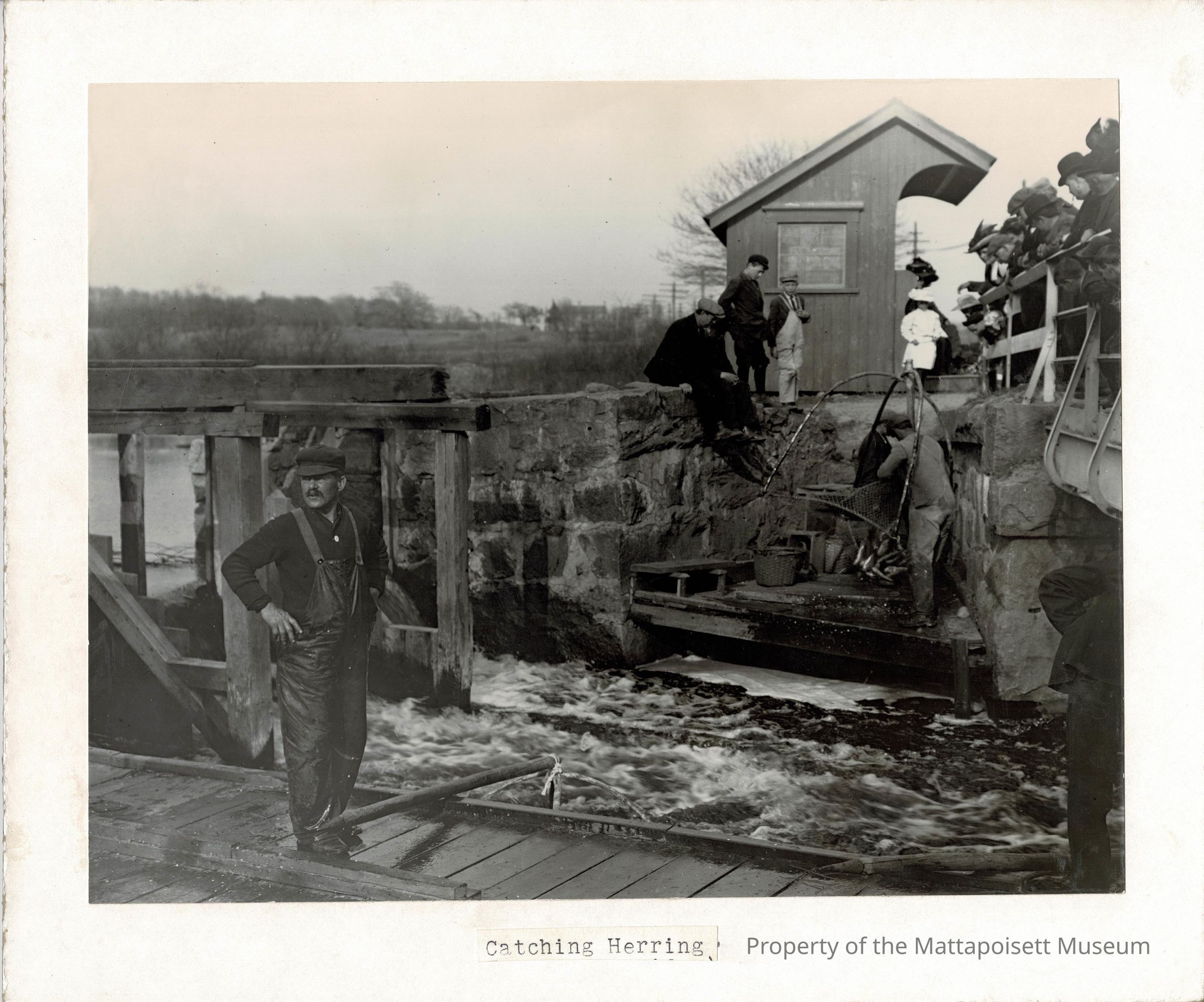 B&W photograph of the Herring Weir on the Mattapoisett River. Note the shelter for the trolley stop next to the bridge.Collection