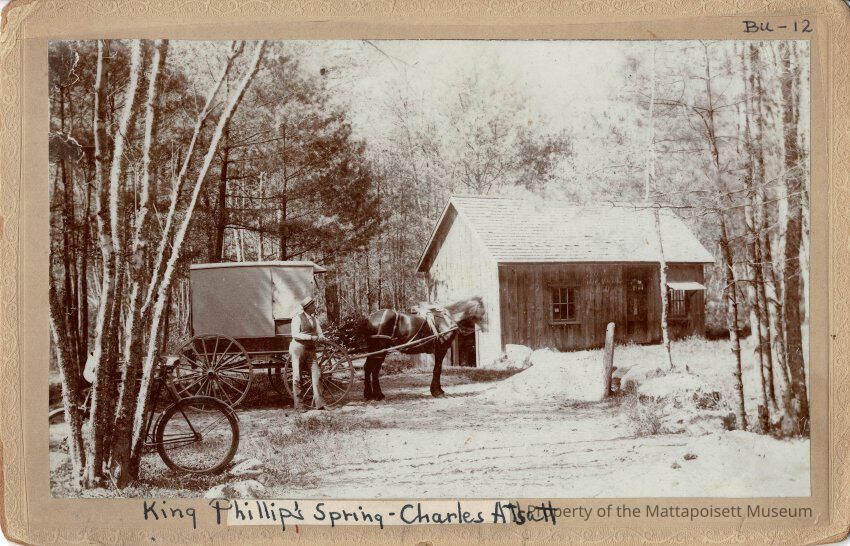 B&W photograph of the Atsatt delivery wagon and spring house at King Phillip's Spring (also known as Crystal Spring). Water was delivered from here to Mattapoisett Neck, Fairhaven, and New Bedford.Collection