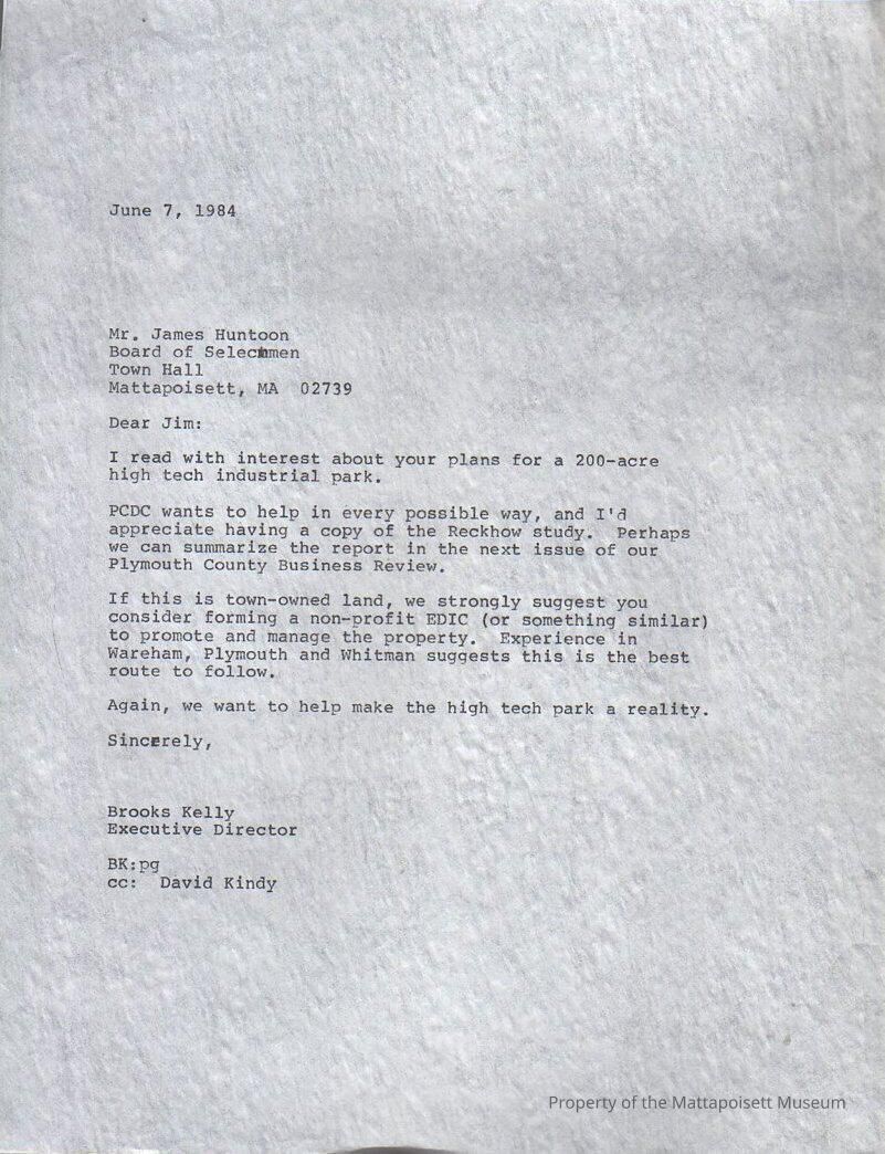 Letter to James Huntoon, Board of Selectmen, Mattapoisett from Brooks Kelly, executive director at PCDC. Suggestion for plans of 200-acre high tech industrial park.Collection