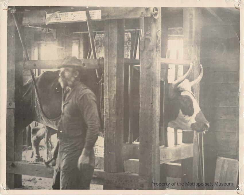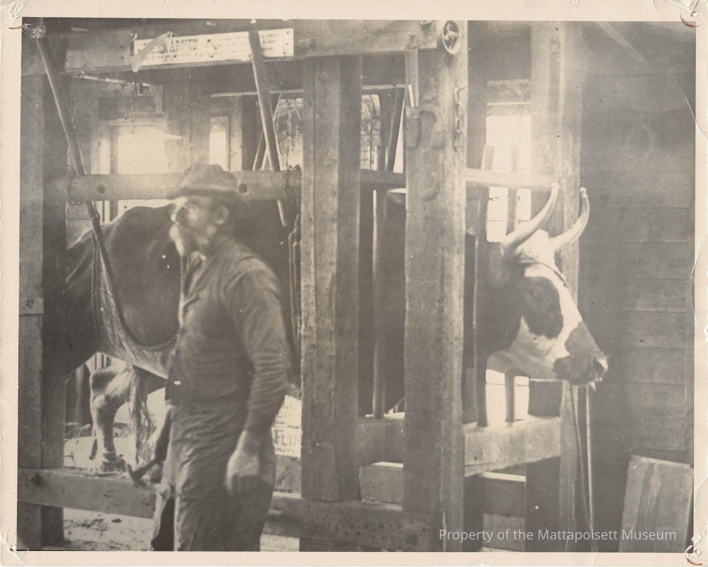 A B&W photo of an ox in a sling for shoeing. Possibly taken in a blacksmith shop on Fairhaven Road (Rt. 6).Collection