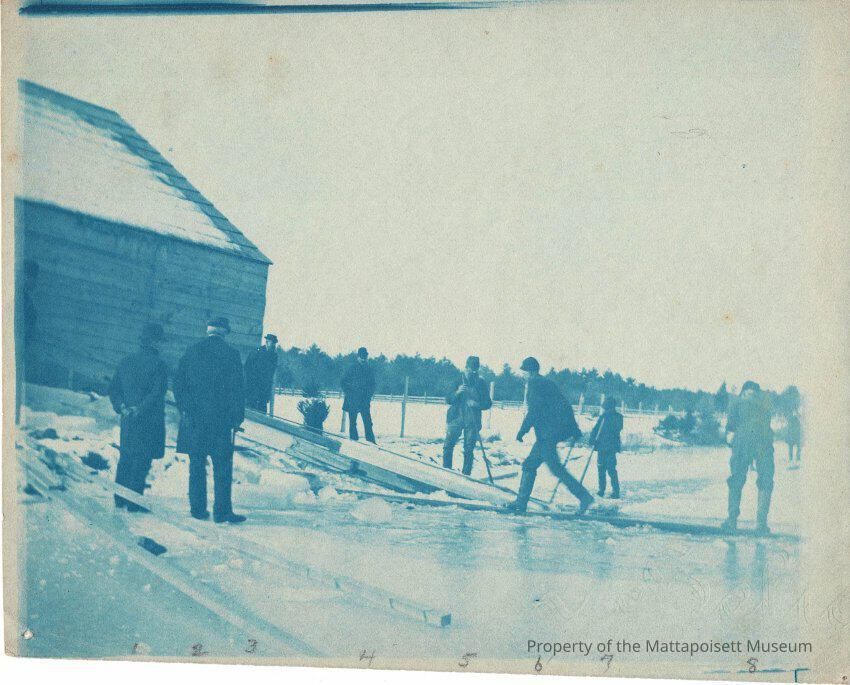 Cyanotype photograph of ice cutting at Mill Pond.Collection