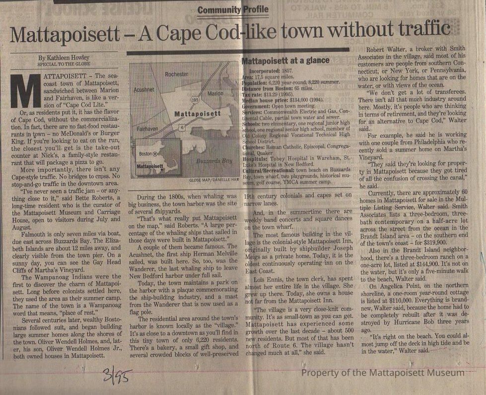 Globe article "Mattapoisett - A Cape Cod-like town without traffic"Collection