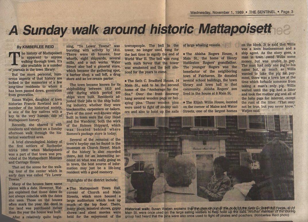Sentinel article "A Sunday walk around historic Mattapoisett". Ye Lower Towne, a walk with Susan Watjen, daughter of Francis Rowland.Collection