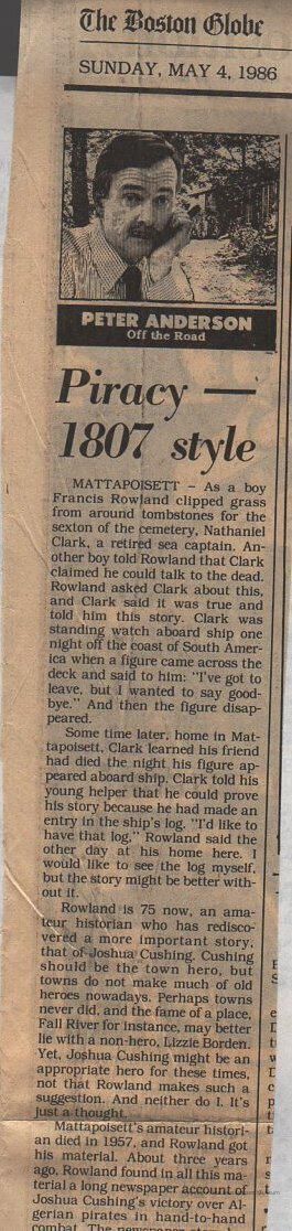 Some time later, home in Mattapoisett, Clark learned his friend had died the night his figure appeared aboard ship. Clark told his young helper that he could prove his story because he made an entry in the ship’s log. “I’d like to have that log,” Rowland said the other day at his home here. I would like to see the log myself, but the story might be better without it.