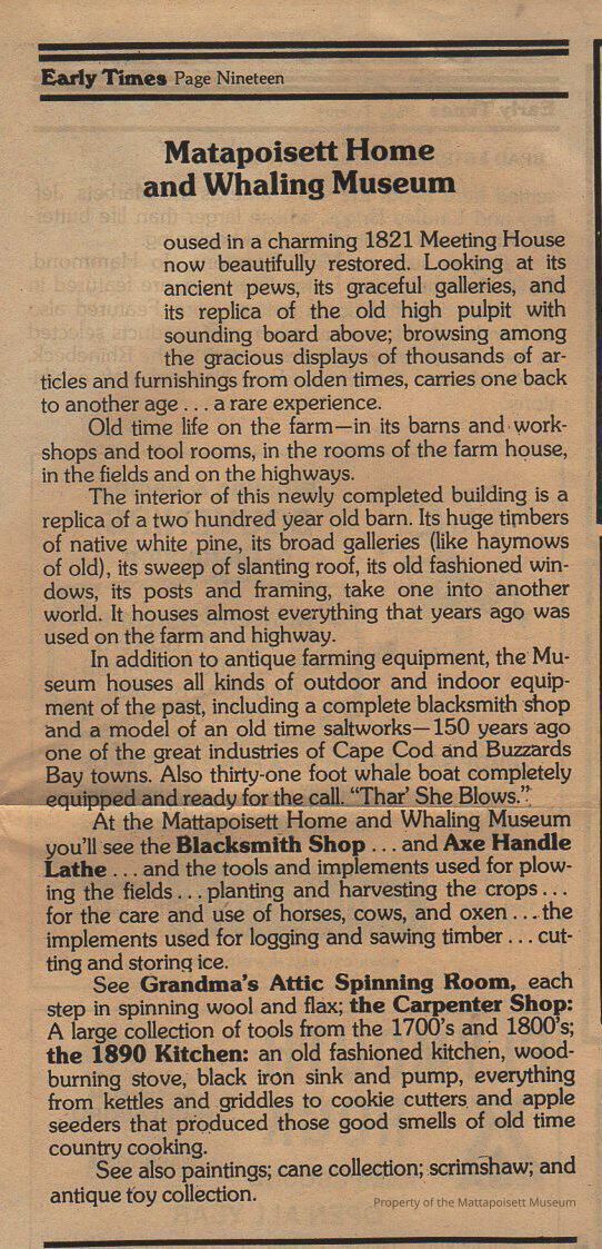 Newspaper article "Mattapoisett Home and Whaling Museum"Collection