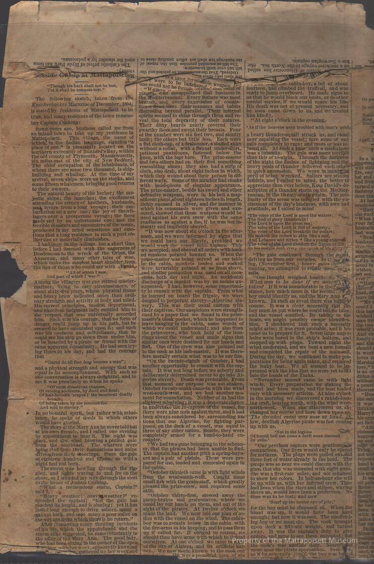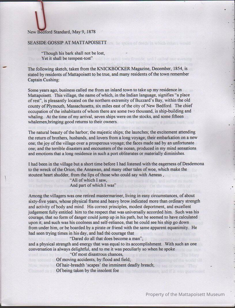Seaside gossip at Mattapoisett. Sketch taken from Knickerbocker Magazine, December 1854, of Captain [Joshua] Cushing. Transcript of newspaper article.Collection