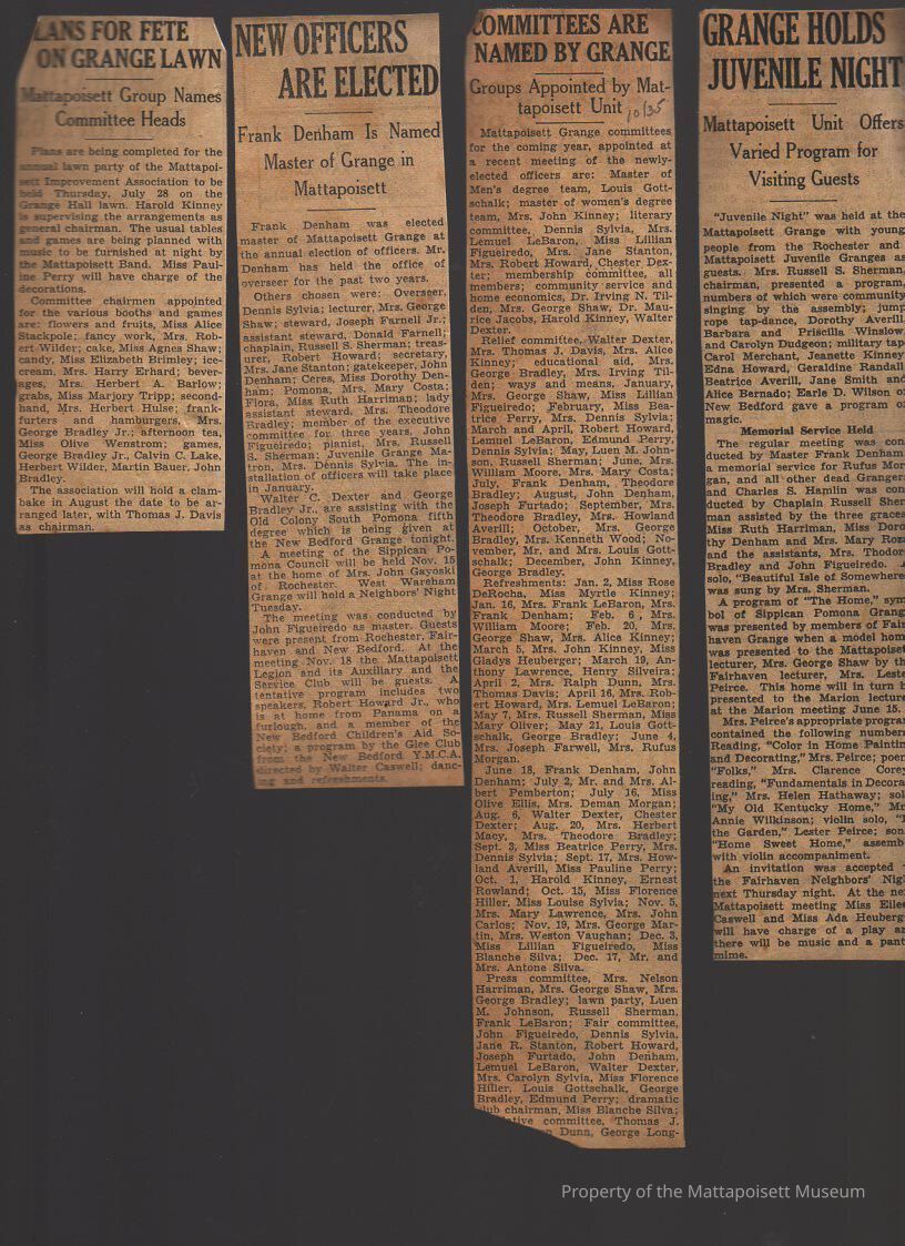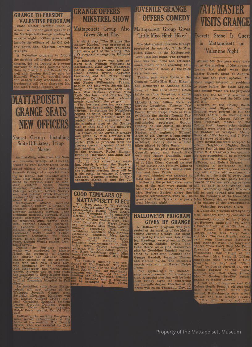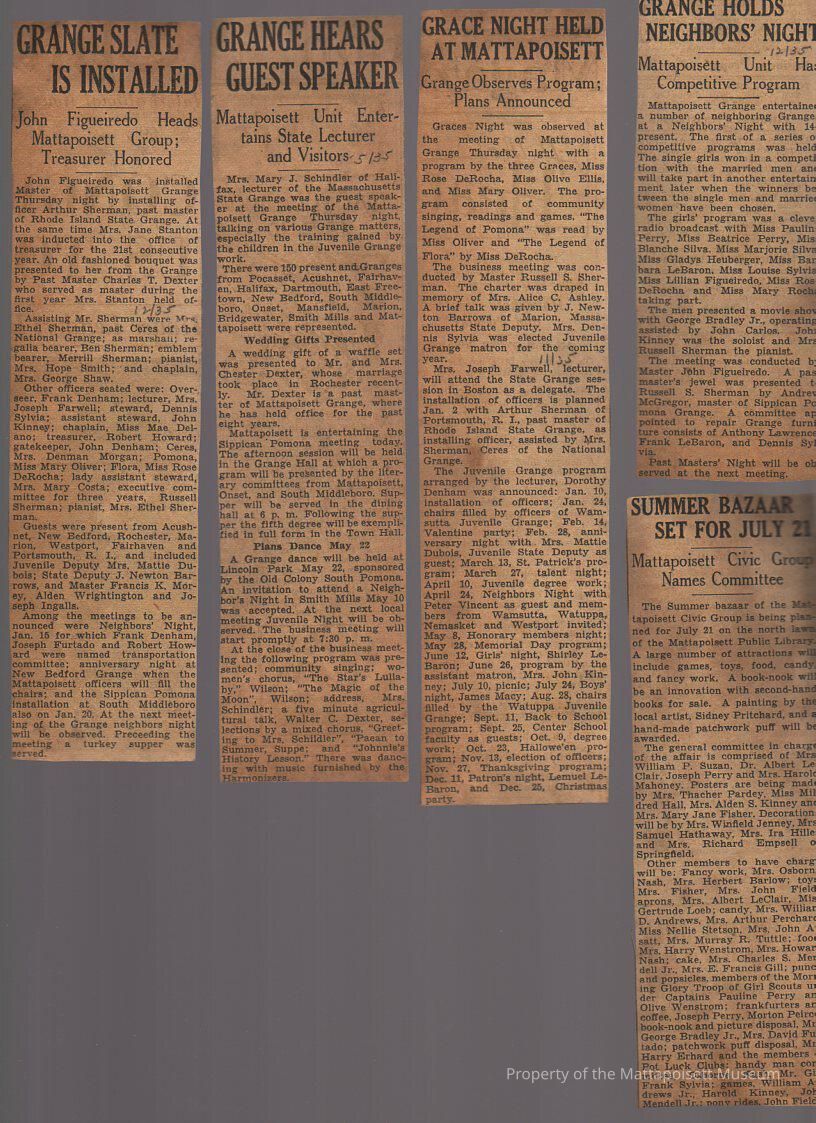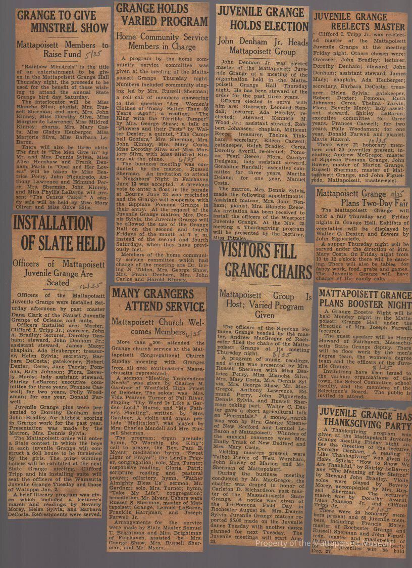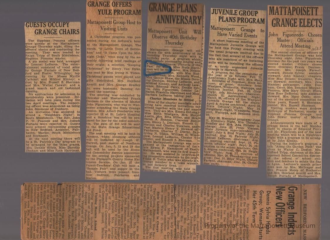 Newspaper clippings about the Mattapoisett Grange.Collection
