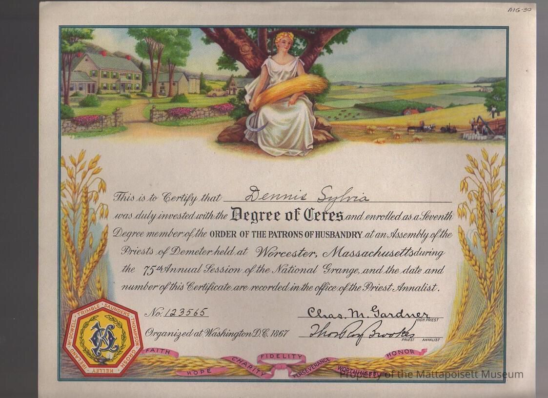 Certificate that Dennis Sylvia was duly invested with the Degree of Ceres as seventh degree member of the Order of the Patrons of Husbandry, 75th session of the National Grange.Collection