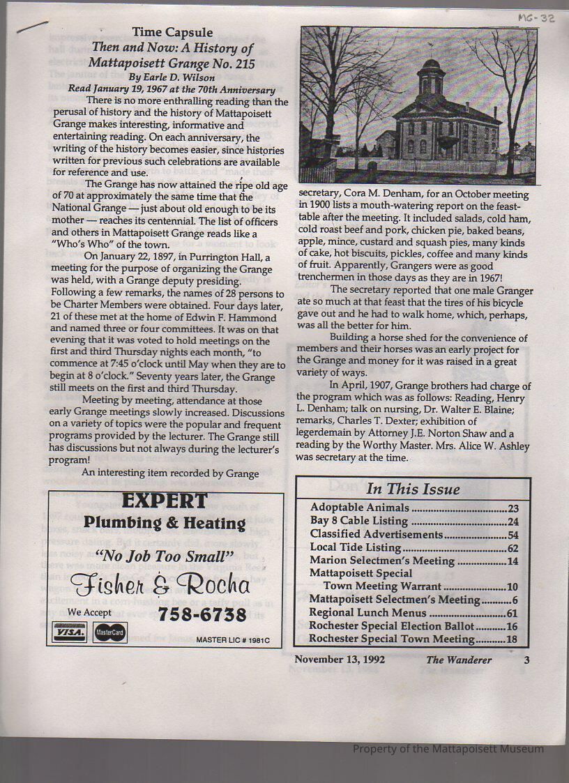 The Wanderer article "Time Capsule: Then and Now: A History of Mattapoisett Grange No. 215". Read January 19, 1967 at the 70th Anniversary.Collection