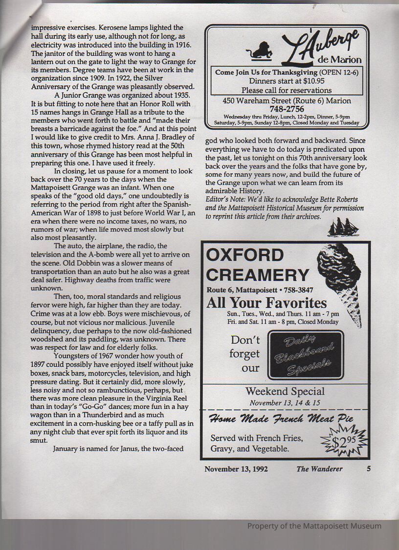 The Wanderer (newspaper), Mattapoisett GrangeArchive Details