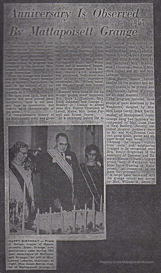 Newspaper photocopy of article "Anniversary is Observed by Mattapoisett Grange".Collection