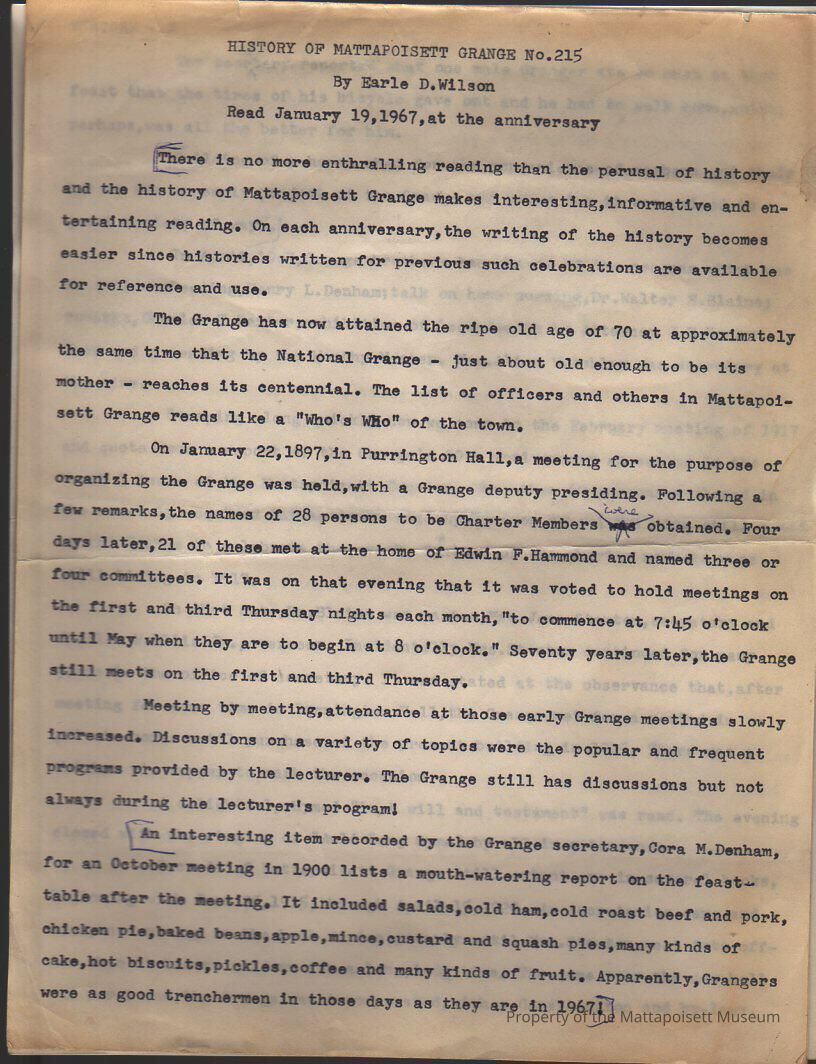 History of the Mattapoisett Grange, No. 215, ready January 19, 1967 at the anniversary.Collection