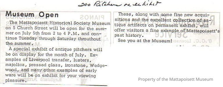 [Presto Press] photocopy article "Museum Open", Mattapoisett Historical Society opens for the summer with over 200 pitchers on exhibit.Collection