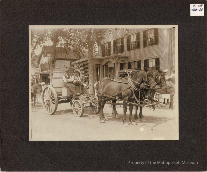 Parade floats. George Austin and Arthur Ashley in the road water wagon in front of the Donovan house on the corner of North and Water Streets.Collection