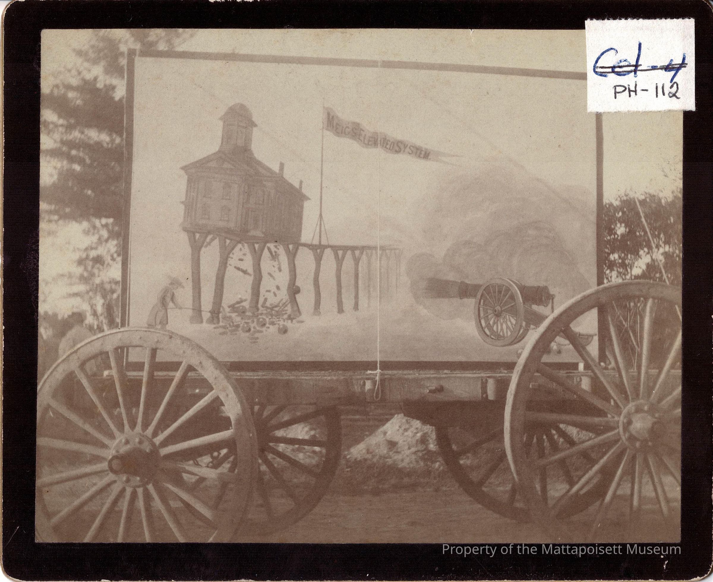 "According to Alice Meigs this was a float in a parade. The picture painted by the [illegible] scenic artist whom E.V. Bird hired to paint the scenery for his theater here. It represents the time Joseph Meigs was attempting to get the salary of the teacher at Barstow School raised from $500 to $750 and was opposed by the other two members of the School Committee - Dr. Cannon and Capt. Macomber."Collection