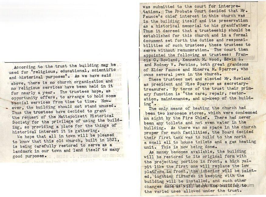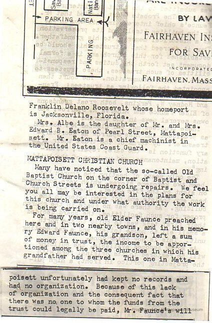 [Presto Press] article (photocopy) "Mattapoisett Christian Church", repairs in memory of Elder Faunce by trust from Grandson Edward Faunce.Collection