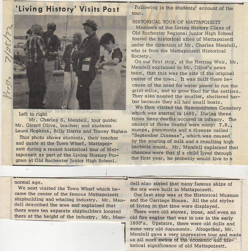 Presto Press article "'Living History' Visits Past" Historical tour of Mattapoisett with Charles S. Mendell.Collection